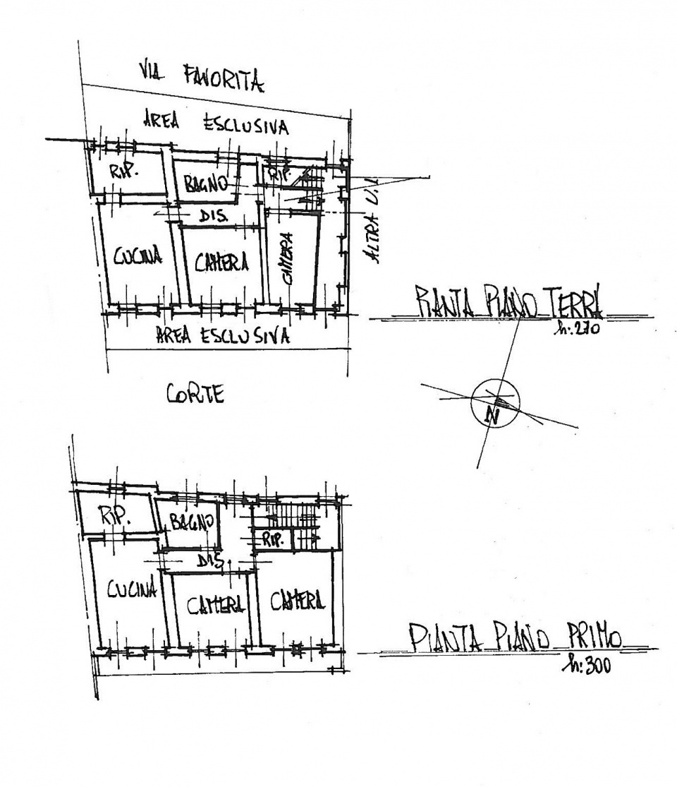 - Piano primo: ingresso, cucina, due camere, cameretta/studio, bagno, ripostiglio e balconata.