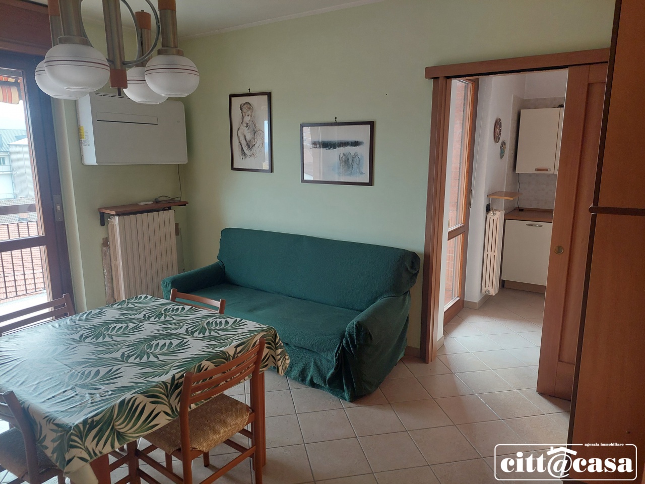CHIVASSO, Via San Carlo. Comodo ai principali servizi e nelle vicinanze della stazione ferroviaria e dell'Isola pedonale, proponiamo in affitto appartamento ammobiliato posto al quarto piano con ascensore, composto da ingresso, tinello con cucinino, disimpegno, una camera, bagno, ripostiglio, due balconi e cantina. L'immobile, che si trova in ottimo stato di manutenzione, dispone di riscaldamento autonomo, videocitofono, portoncino blindato, infissi con doppi vetri, tende invernali ed estive e climatizzatore monosplit,. L'intero stabile è privo di barriere architettoniche. Libero subito.